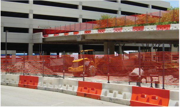 The Aerocade® Airport Barricade is a low-profile, water-filled, collapsible channelization device used to delineate work zones for construction and maintenance on airport runways and taxiways. The Aerocade® can be interconnected end-to-end for use as a demarcation device and can be accessorized with warning lights and flags.