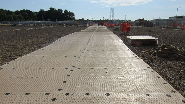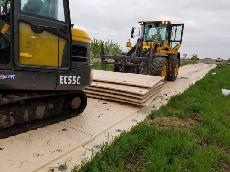 Rent heavy-duty, anti-skid access mats and other temporary roadway solutions that transform rough, soft, or unstable ground conditions into stable and weatherproof surfaces. Install our composite mats to easily transport specialized service vehicles and components, or create a staging and storage area for equipment, mobile offices, or trailers. The mats are made of High-Density Polyethylene (HDPE) with specialized fillers for strength, plus UV and anti-static additives to withstand the rigors of heavy construction.